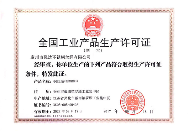 泰州市強(qiáng)達(dá)不銹鋼絲繩有限公司位于江蘇興化市戴南經(jīng)濟(jì)開發(fā)區(qū),公司致力于不銹鋼絲繩產(chǎn)品生產(chǎn),立志成為“國內(nèi)技術(shù)標(biāo)桿型吊索具生產(chǎn)企業(yè)”。以此戰(zhàn)略思想指導(dǎo),公司堅(jiān)決貫徹“質(zhì)量贏市場,管理增效益,誠信贏天下”的質(zhì)量方針。以完善的服務(wù)在國內(nèi)不銹鋼絲繩市場樹立良好的品牌形象。公司榮獲“江蘇省質(zhì)量信得過企業(yè)。 靈活的管理機(jī)制,經(jīng)驗(yàn)豐富的